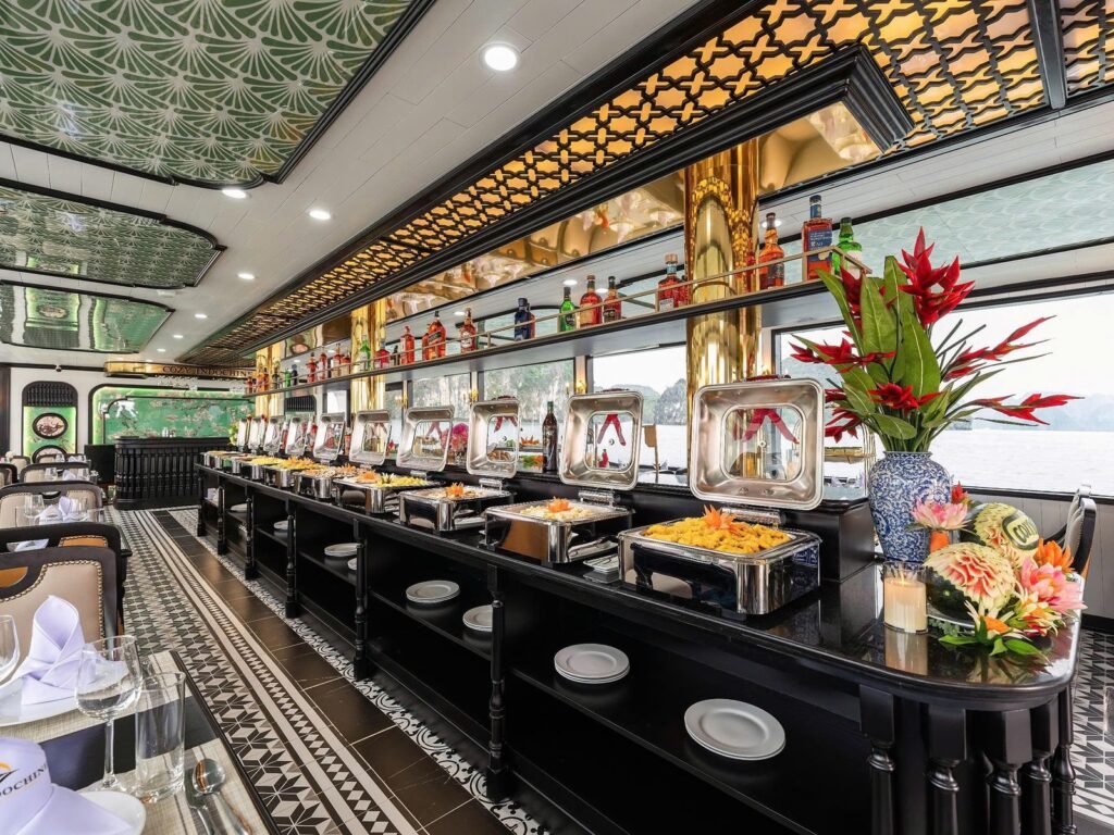 - 11:00–11:15: Arrive at Tuan Chau Harbor. Welcome aboard Cozy Bay Premium Cruise. Enjoy a buffet lunch while the cruise begins a 6.5-hour journey along Route 2, passing uninhabited islets and uniquely shaped limestone formations.